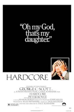 The second film, Hardcore, is not only written by Schrader, but also directed by him. There’s also a chapter in Cinema Speculation devoted to that film, just as there was with Rolling Thunder. The film stars George C. Scott as Jake Van Dorn, a conservative Dutch Calvinist from Grand Rapids, MI (very much the milieu Schrader grew up in and rejected to become a filmmaker) whose daughter goes missing during a mission trip to California and becomes involved in the world of pornography. The film also stars Peter Boyle (strengthening its connection to Taxi Driver) and Season Hubley.